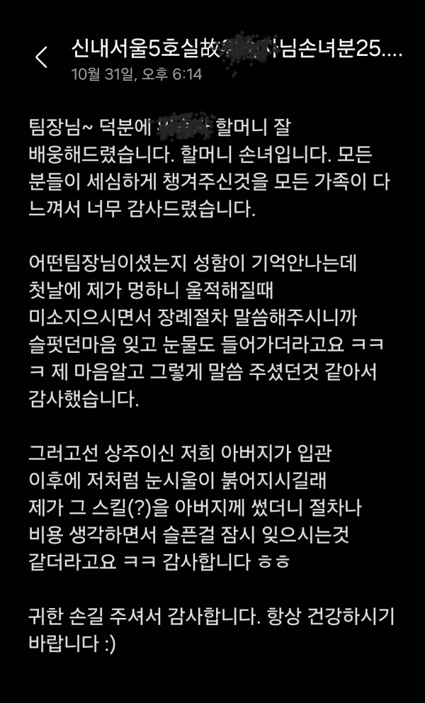 기초생활수급자 장례후 유족분 감사문자 전달 드립니다.